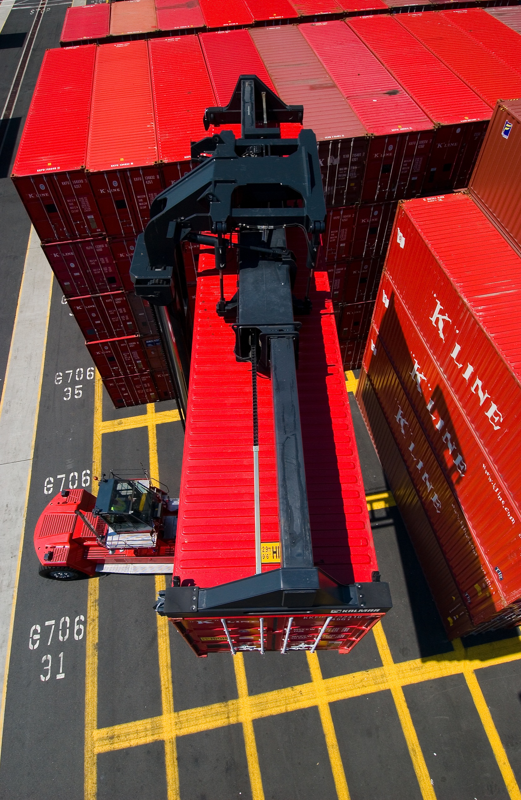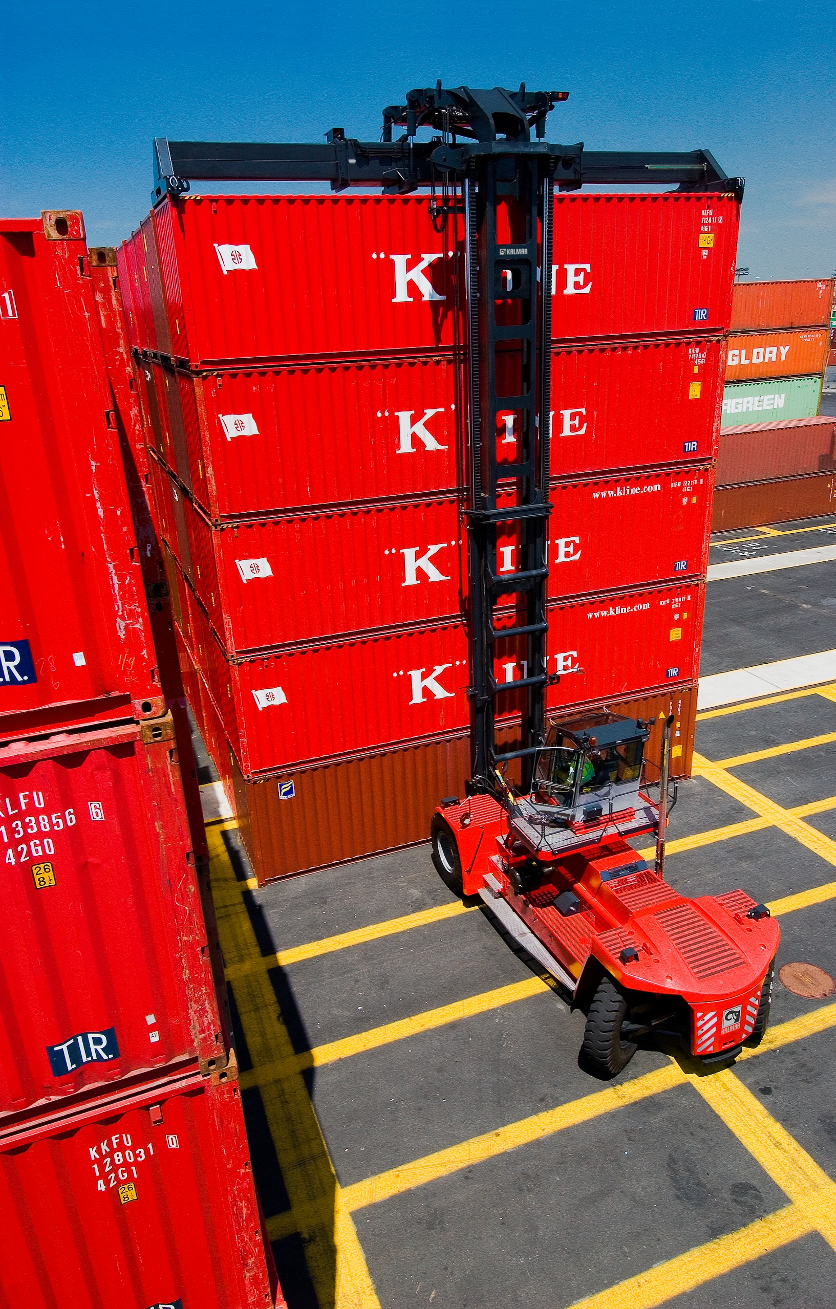 Le chariot pour la manutention de conteneurs pleins a une capacité de 41 tonnes. Il peut gérer des conteneurs de 20 à 40' et empiler jusqu'à cinq conteneurs à pleine capacité. Pour maximiser la productivité et la sécurité, les chariots de manutention top-lift Kalmar sont conçus pour offrir à l'opérateur une visibilité totale et un contrôle parfait sur chaque étape du processus de manutention. La combinaison de notre cabine Spirit Delta, du mât ouvert et du design du portique garantissent une visibilité à 360º, tandis que le système de rétroaction et de contrôle électronique assurent un contrôle précis du palonnier pour les niveaux irréguliers ou la gestion des charges , de l'inclinaison du mât, de l'extension et du verrou tournant.