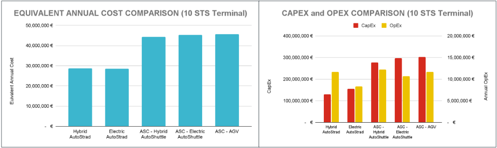 Our example again assumes a European container terminal with ten STS cranes and a weighted average cost of capital of 10%. Equipment lifetimes are calculated at 15 years for the AutoStrad™, 25 years for the ASC and 20 years for the AGVs serving the crane.